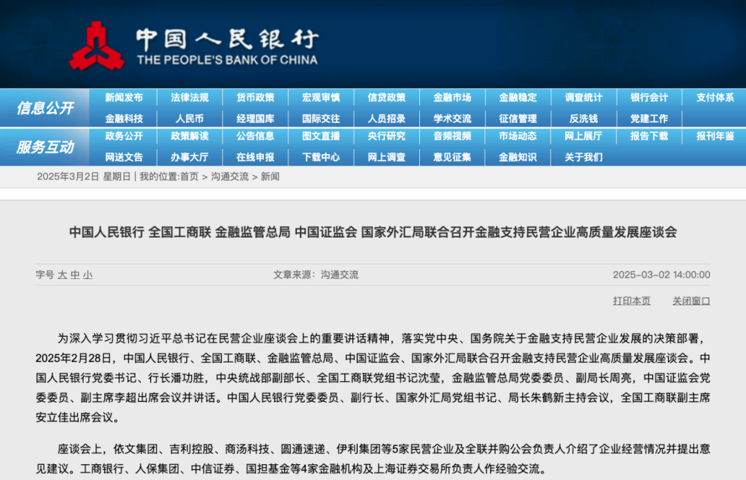 中国人民银行官网今日发布消息,2025年2月28日,中国人民银行、全国工商联、金融监管总局、中国证监会、国家外汇局联合召开金融支持民营企业高质量发展座谈会。